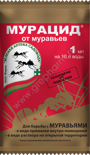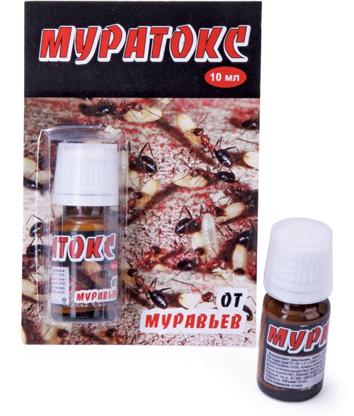 «МУРАТОКС» — инсектицид широкого спектра действия, для борьбы с муравьями, блохами, личинками подвальных комаров (концентрат эмульсии, 600 г/л диазинона). Эффективно уничтожает муравьев в местах их скопления и на пути передвижения, в том числе в отмостках домов и на тротуарах.