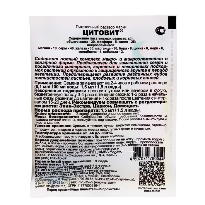 Микроудобрение с макро и микро элементами «ЦИТОВИТ», 1.5 мл, «НЭСТ М»