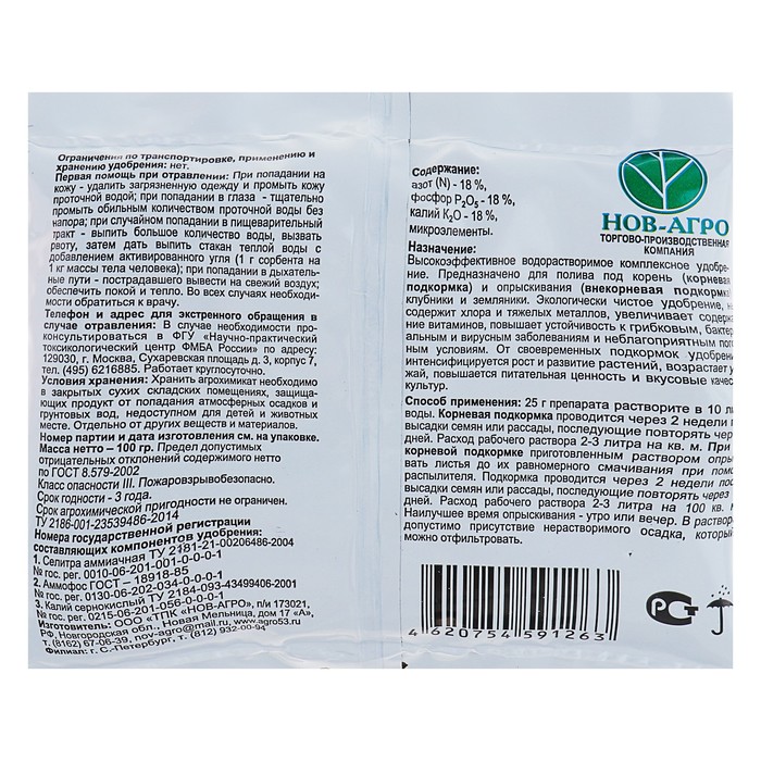 Состав: N - 18%, P2O5 – 18%, K2O – 18%.