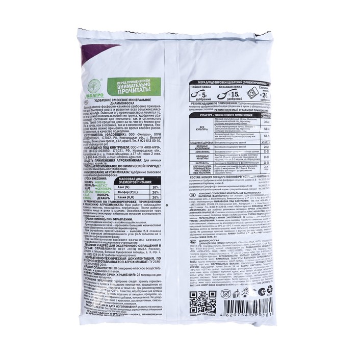 Состав: N - 10%, P2O5 – 26%, K2O – 26%.