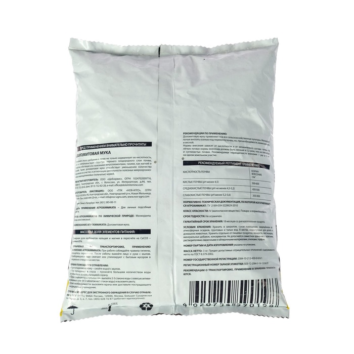 Известняковая (Доломитовая) мука —предназначена для известкования кислых почв, обогащения ее кальцием и магнием. Почва после добавления муки становится более рыхлой, усиливается жизнедеятельность полезных для возделывания культур микроорганизмов, повышается эффективность вносимых удобрений.