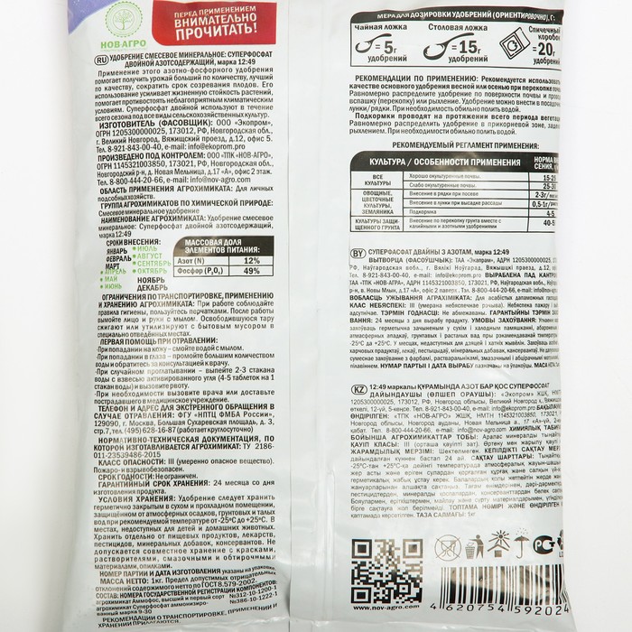 Суперфосфат двойной азотсодержащий — высококонцентрированное фосфорное удобрение. Используется для основного и предпосевного внесения, а также для подкормок овощных, плодово-ягодных, цветочных и др. культур, выращиваемых на всех типах почв. Обеспечивает развитие корневой системы, ускоряет рост и цветение растений, созревание плодов.