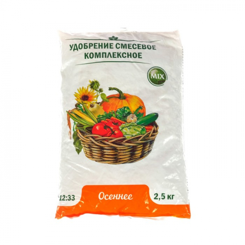Высокоэффективное «Осеннее» комплексное удобрение с микроэлементами» специально разработано для применения на садовых, огородных и приусадебных участках в летне-осенний период. Используется для основного внесения под осеннюю перекопку и при осенней посадке луковичных культур, земляничной рассады, плодово-ягодных, а также хвойных деревьев и кустарников. Благодаря наличию комплекса микроэлементов и повышенному содержанию калия и фосфора повышает иммунитет и улучшает холодо- и морозостойкость растений.