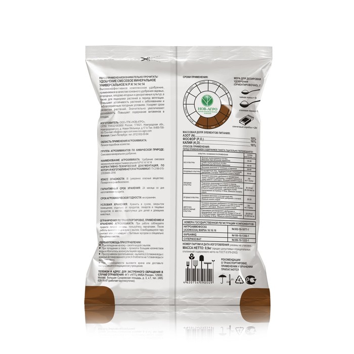 Удобрение "НОВ-АГРО" минеральное, универсальное - подходит для выращивания садовых, огородных, плодово-ягодных и декоративных культур, а также для подкормки растений в период вегетации.
