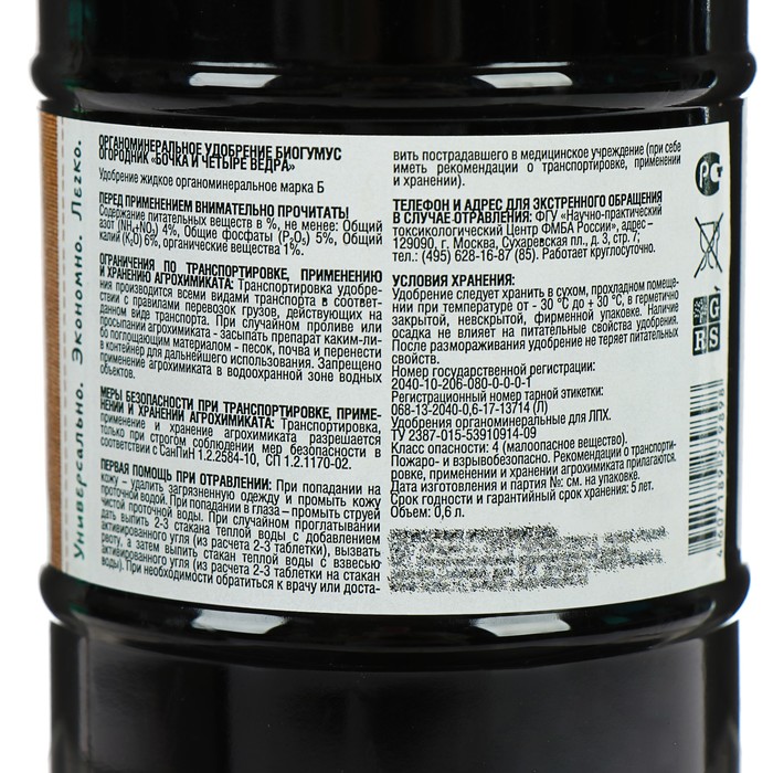 Удобрение жидкое Огородник Бочка и четыре ведра Биогумус органоминеральное 0,6л
