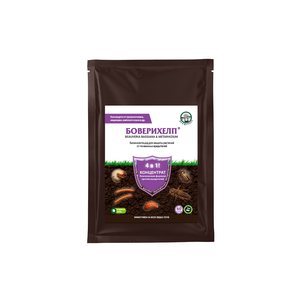 ЭкоДачник Боверихелп– биоинсектицид для защиты растений от почвенных вредителей. Средство обладает высокой скоростью и эффективностью обезвреживания и гибели вредителей, улучшает фитосанитарное состояние и оздоравливает почву, не вызывает резистентности у вредителей. Энтомопатогенные грибы Beauveria bassiana проникают через хитиновые покровы вредителей, поражают жировую ткань и кишечник, расщепляют хитин и образуют ватоподобный налёт мицелия на теле насекомых, вызывая нарушение всех функций организма. Грибы способны приживаться в почве, обеспечивая многолетний эффект – сдерживание размножения насекомых.Преимущества:• нет срока ожидания до сбора урожая;• экологически безопасен для человека, растяжений, пчёл;• совместим с химическими и биологическими инсектицидами, водорастворимыми минеральными удобрениями.