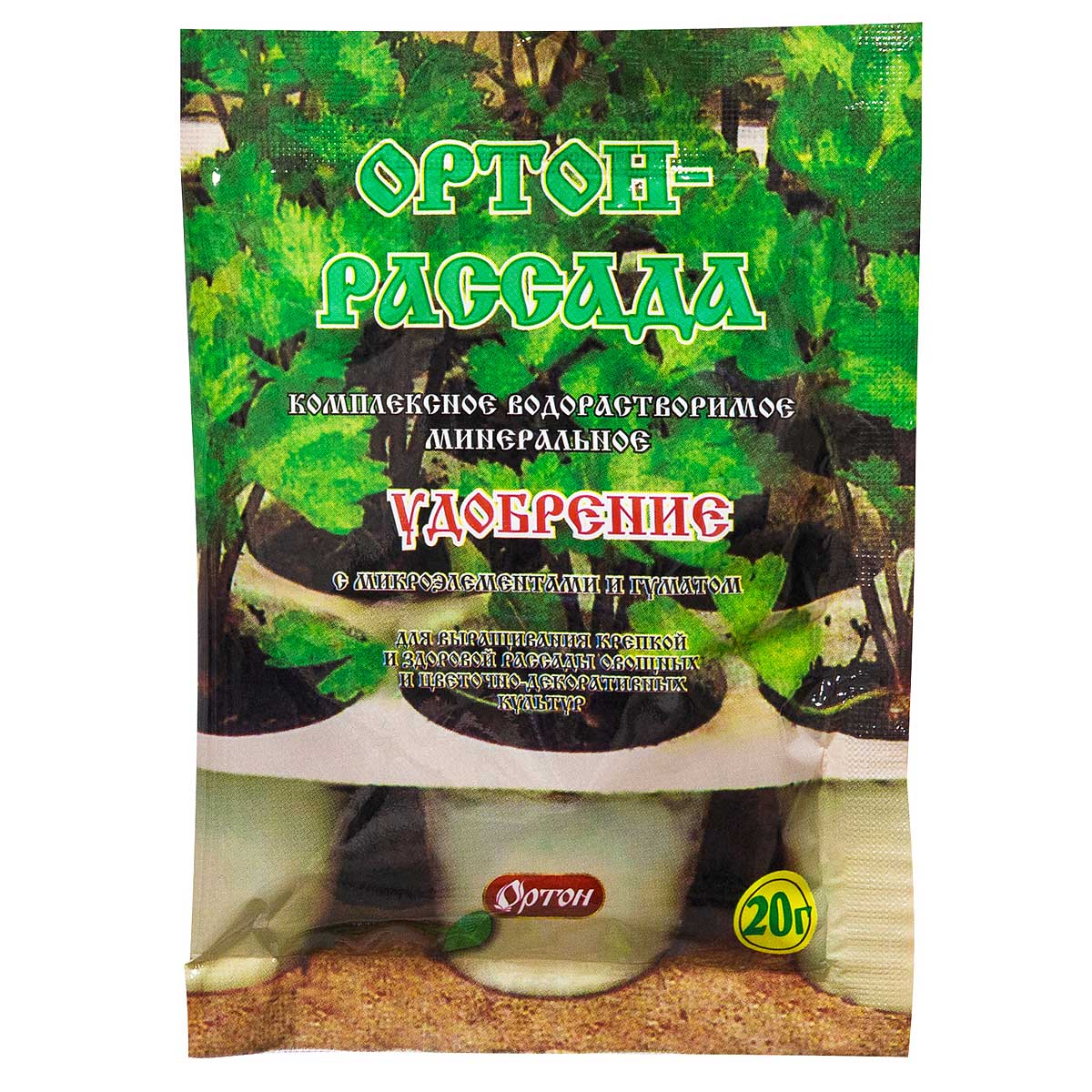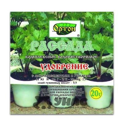 Комплексное водорастворимое минеральное удобрение с микроэлементами и гуматом «Ортон–Рассада» (в %, N:P:K – 10:5:20 + MgO 2,5 + микроэлементы + соли гуминовых кислот 3,5). Назначение: для выращивания здоровой и крепкой рассады овощных и цветочно-декоративных культур. Применение: