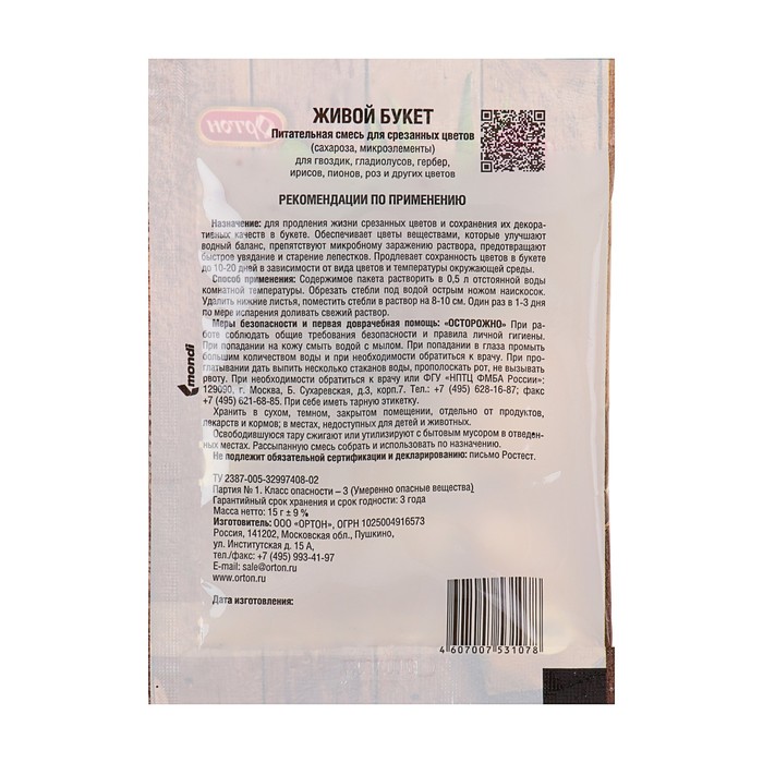 Универсальная подкормка для срезанных цветов "Живой букет", Ортон, 15 г