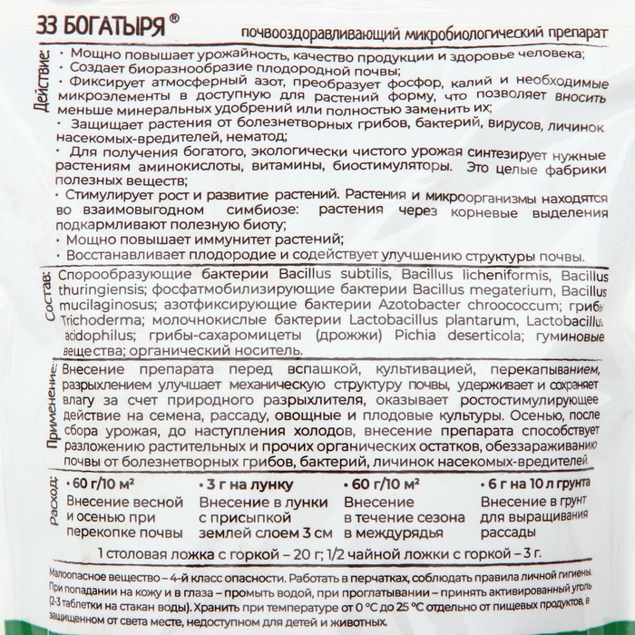 Применение: разрыхлением улучшает механическую структуру почвы, удерживает и сохраняет влагу за счет природного разрыхлителя, оказывает ростостимулирующее действие на семена, рассаду, овощные и плодовые культуры. Осенью, после сбора урожая, до наступления холодов, внесение препарата способствует разложению растительных и прочих органических остатков, обеззараживанию почвы от болезнетворных грибов, бактерий, личинок насекомых-вредителей.