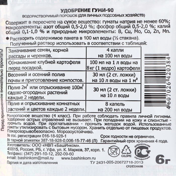 Удобрение Гуми-90 Для овощей, ягод, плодов, цветов, 6 г