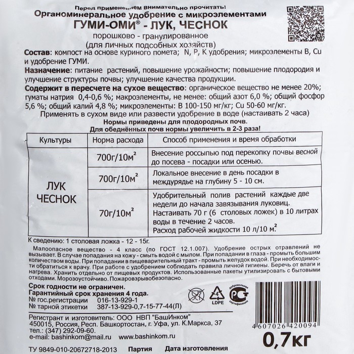 "Удобрение Гуми-Оми для лука и чеснока органоминеральное 0.7 кг - удобрение с микроэлементами для луковичных культур.