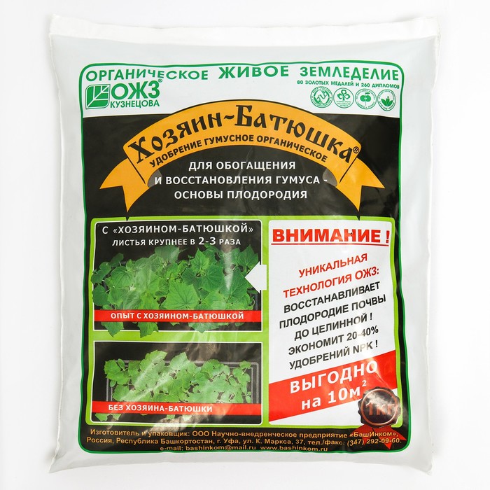 Природный гумусный препарат длительного (пролонгированного) действия. Для мощного повышения плодородия почвы и урожайности, увеличения гумусного слоя, улучшения структуры почвы, повышения эффективности питания растений, снижение нитратов и нейтрализации тяжелых металлов и др. вредных веществ, оздоровления почвы, активизации полезной почвенной микрофлоры и ликвидации усталости почвы.