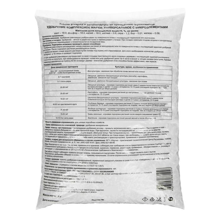 Удобрение минеральное "Пермагробизнес", универсальное с микроэлементами, 3 кг.Удобрение "Пермагробизнес" представляет собой универсальное минеральное удобрение с микроэлементами, предназначенное для основного внесения и подкормок овощных, плодово-ягодных и цветочных культур. Благодаря своему составу, данное удобрение обеспечивает растения всеобъемлющим питанием, способствуя их здоровому росту и развитию.Массовая доля питательных веществ в удобрении "Пермагробизнес" следующая:- азот – 18%;- фосфор – 18%;- калий – 18%;- магний – 0,6%;- сера – 1,2%;- бор – 0,01%;- железо – 0,06%.Этот баланс элементов обеспечивает оптимальные условия для роста и развития растений, способствуя формированию качественного урожая. Азот, фосфор и калий играют ключевую роль в обеспечении энергии и питательных веществ для растений, а микроэлементы, такие как магний, сера, бор и железо, необходимы для поддержания здоровья и иммунитета растений.Удобрение "Пермагробизнес" рекомендуется использовать как для первоначальной подготовки почвы перед посадкой растений, так и для периодических подкормок в течение всего сезона. Равномерно распределите удобрение по почве, затем аккуратно внесите его в верхний слой почвы и полейте участок. При использовании удобрения следует соблюдать рекомендуемые дозировки в зависимости от типа почвы и видов культур.Начните использовать удобрение "Пермагробизнес" уже сегодня, чтобы обеспечить растениям все необходимые питательные элементы и вырастить богатый урожай. При правильном применении данного удобрения вы сможете достичь заметного улучшения качества и количества урожая, а также создать благоприятные условия для здорового роста и развития растений на вашем участке.