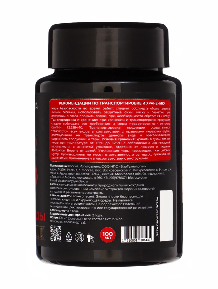 Содержит в себе комплексы активных фитокомпонентов и экстрактов морских водорослей, которые улучшают окраску и текстуру, придавая плодам красивый внешний вид и лучшую сохранность. Натуральный состав обеспечивает безопасность подкормки для людей и животных, а также средство не является пестицидом или агрохимикатом.