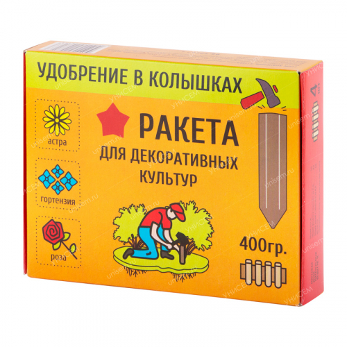 Ракета удобрение в колышках– комплексное минеральное удобрение с содержанием полного набора биогенов. Удобрение представляет собой брикет – удобрительный колышек. Применяется для внесения в качестве основного удобрения в почву (весной или осенью) и подкормок декоративных растений: роза, гортензия, пирея, шиповник, сирень, астра. Растворение удобрения происходит постепенно в течение всего вегетативного сезона, в отличие от традиционных удобрений, которые сразу растворяются и вымываются из почвы. Препарат не перенасыщает почву солями.• Удобрение содержит полный комплекс веществ, необходимых для полноценного и сбалансированного питания растений.