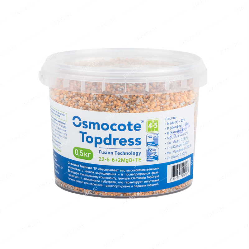 Osmocote TopDress FT (4-5 мес) – комплексное, минеральное, нерастворимое удобрение пролонгированного действия. Период действия – 4-5 месяцев. Применяется для клумбовых растений, таких как петуния, бегония и герань. Благодаря специальному компоненту, гранулы Osmocote TopDress прилипают к поверхности субстрата, что гарантирует отсутствие потери гранул при переносе, транспортировке и падении горшков. Удобрение содержит азот и фосфор с быстрым и медленным высвобождением, имеет мелкий размер гранул для равномерного распределения. Вес – 0,5 кг.