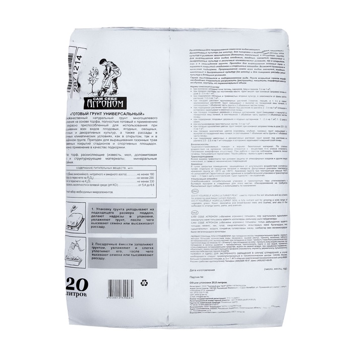 Высококачественный натуральный грунт многоцелевого назначения на основе торфа, полностью готовый к применению и прекрасно приспособленный для использования при выращивании рассады всех видов плодовых, ягодных, овощных, цветочных и декоративных культур открытого и защищенного грунта. Обеспечивает оптимальные условия для повышения всхожести семян, лучшей приживаемости рассады, улучшения эстетических качеств цветочных и декоративных культур. Возможно применение в качестве подкормки.