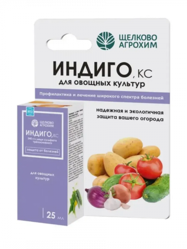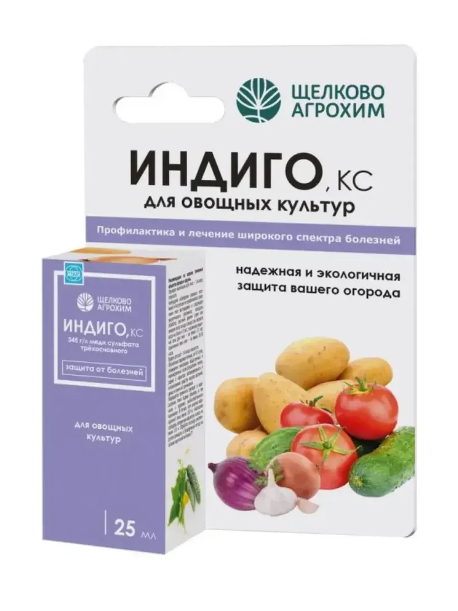 Щелково Агрохим Индиго, КС– высокоэффективный контактный фунгицид, предназначенный для борьбы с комплексом болезней на овощных культурах. Ионы меди попадают в клетки фитопатогенных спор и начинают взаимодействовать с ферментами. Как результат, споры прекращают расти и не могут нанести вред растению. Действие «Индиго, КС» начинается сразу после обработки и продолжается в течение 14 дней в зависимости от погодных условий и инфекционной нагрузки. Максимальный фунгицидный эффект проявляется при профилактическом применении до появления симптомов болезни. Активен при температуре от 0°C до +35°C, не смывается дождём.Преимущества:• концентрат в жидкой форме, не выпадает в осадок;• безопасен для культур, совместим с другими препаратами;• активен при температуре от 0 °C до +35 °C, не смывается дождём.Результат:• отсутствие привыкания у патогенов:• защита от опасных заболеваний сразу после обработки:• современный метод предупреждения развития комплекса заболеваний.