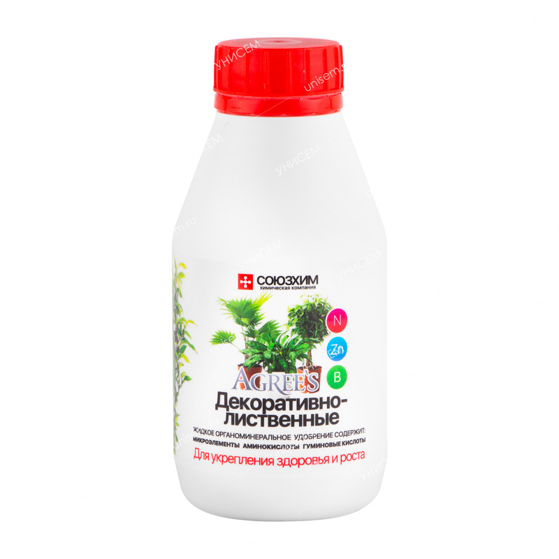 AGREE'S для декоративно-лиственных– жидкое органоминеральное удобрение с микроэлементами, аминокислотами и гуминовыми кислотами. Применяется в качестве корневой и внекорневой подкормки для всех декоративно-лиственных растений. Препарат обеспечивает активный рост и развитие растения, улучшение декоративных качеств и укрепление иммунитета.• Удобрение содержит полный комплекс веществ, необходимых для полноценного и сбалансированного питания растений.