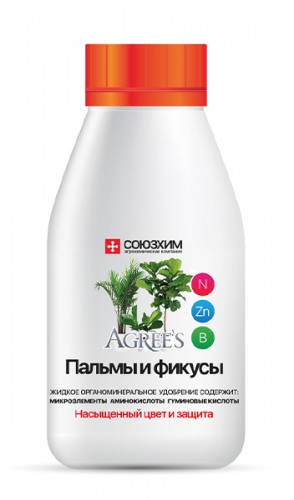 Союзхим AGREE`S Пальмы и фикусы– жидкое органоминеральное удобрение для пальм и фикусов. Применяется для корневой и внекорневой подкормки растений. Удобрение содержит микроэлементы, аминокислоты и гуминовые кислоты в легкодоступной форме, обеспечивает насыщенный цвет листьев и защиту, улучшает декоративный вид, повышает иммунитет.Преимущества:• улучшает декоративность;• повышает иммунитет растений;• активен на любой стадии вегетации.