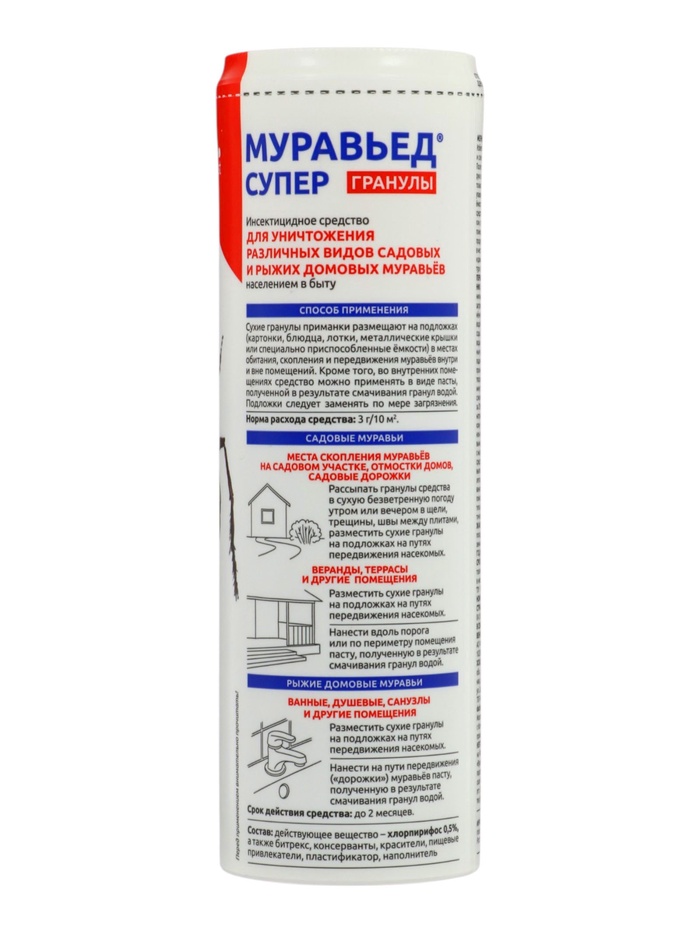 Муравьед – инсектицид контактно-кишечного действия против муравьёв. Попадая с пищей в организм муравьёв, он воздействует на нервную систему насекомых, вызывает паралич и уже в течение первых трёх суток после обработки неминуемо приводит к их гибели.