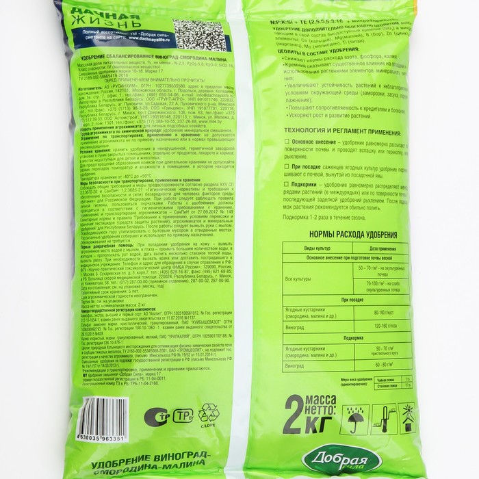 Сухое удобрение Добрая сила, для Винограда, Смородины, Малины, 2 кг