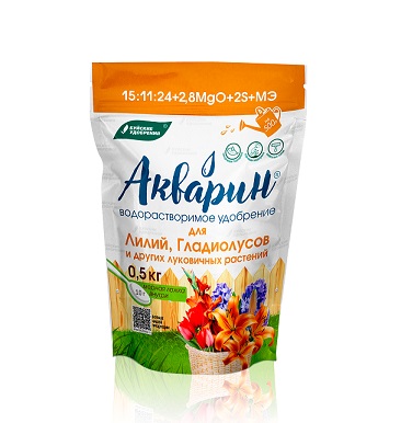 "Акварин" для лилий, гладиолусов и других луковичных растений - водорастворимое удобрение, в состав которого входит азот, фосфор, калий, магний, сера и микроэлементы – железо, цинк, марганец, медь в хелатной форме, а бор и молибден – в минеральной. Благодаря кислой реакции (рН) удобрения, оно легко растворяется в холодной воде и более эффективно усваивается корневой системой или листовой поверхностью растений.