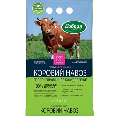 Коровий навоз содержит минеральные вещества: NPK, микроэлеменаты (медь, цинк, марганец) в легкоусвояемой форме и природные стимуляторы роста.