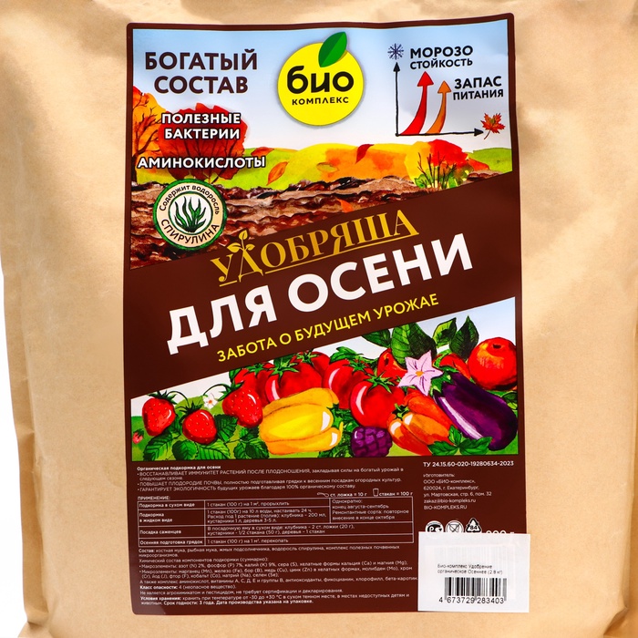 К концу дачного сезона очень важно позаботиться об отплодоносивших многолетниках и о земле, взрастившей урожай, отдавшей на это много полезных элементов.Восполнить истраченное поможет «УДОБРЯША для осени» - удобрение, которое нужно вносить под деревья и кустарники, а также при перекопке грядок.Бонус! «УДОБРЯШУ для осени» можно использовать для дозревания урожая (поздние томаты, яблоки и груши, ремонтантные сорта клубники и малины, тыква, корнеплоды и пр.).«УДОБРЯША» содержит в идеальных пропорциях 18 важнейших восстанавливающих плодородие элементов, полезные почвенные бактерии, витамины и аминокислоты.Особый компонент состава - ВОДОРОСЛЬ СПИРУЛИНА.Спирулина входит в список самых полезных продуктов в мире!Эта водоросль - кладезь полезных компонентов. Она содержит:· растительный белок,· 11 микроэлементов, включая редчайший селен (Se), обеспечивающий растениям двойную стрессоустойчивость,· хлорофилл,· бета-каротин,· все важнейшие аминокислоты и витамины. Полезные свойства подкормки «УДОБРЯША для осени»:• ПОВЫШАЕТ ПЛОДОРОДИЕ ПОЧВЫ, полностью подготавливая с осени грядки к весенним посадкам огородных культур.• ДЛЯ МНОГОЛЕТНИКОВ - УСИЛИВАЕТ МОРОЗОСТОЙКОСТЬ и ОБЕСПЕЧИВАЕТ ЗАПАСОМ ПИТАНИЯ до весны.• ГАРАНТИРУЕТ ЭКОЛОГИЧНОСТЬ урожаев благодаря 100% органическому составу.Состав: костная мука, рыбная мука, жмых подсолнечника, водоросль спирулина, комплекс полезных почвенных микроорганизмов.Химический состав компонентов удобрения:· Макроэлементы: азот (N) 2%, фосфор (P) 7%, калий (К) 9%, сера (S), хелатные формы кальция (Ca) и магния (Mg);· Микроэлементы: марганец (Mn), железо (Fe), бор (B), медь (Cu), цинк (Zn) в хелатных формах, молибден (Mo), хром (Cr), йод (J), фтор (F), кобальт (Co), натрий (Na), селен (Se);А также комплекс аминокислот, витамины А, С, Д, Е и группы B, антиоксиданты, фикоцианин, хлорофилл, бета-каротин.