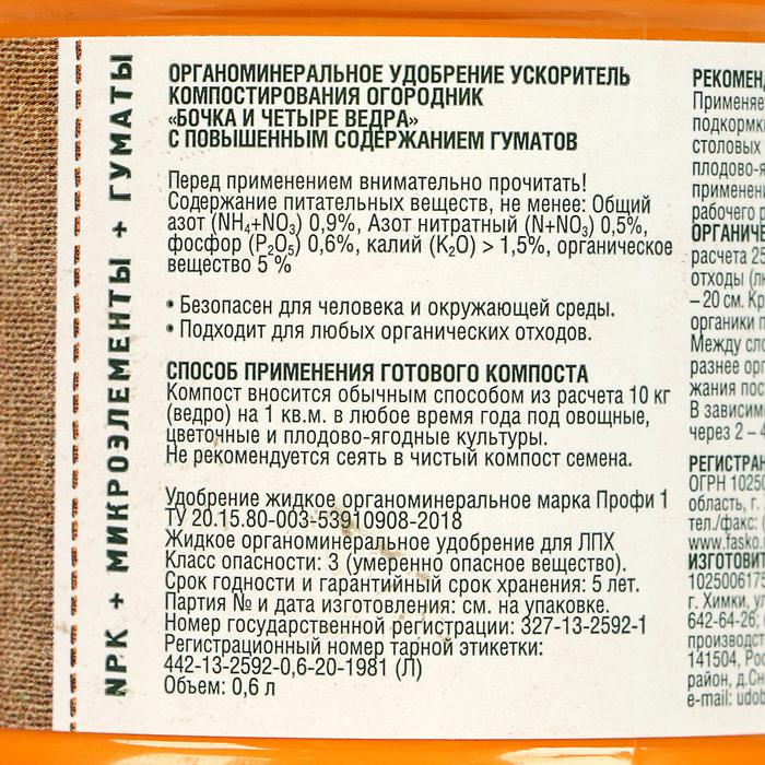 Удобрение органоминеральное «Огородник», ускоритель компостирования, «Бочка и 4 ведра», 600 мл