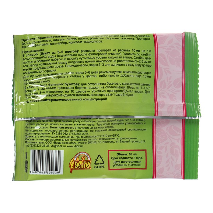 Средство значительно увеличивает продолжительность жизни почти всех срезанных цветов. Может использоваться для цветочных композиций в вазе или насыщения цветочной пены, дополняет и увеличивает восприятие качества букета.