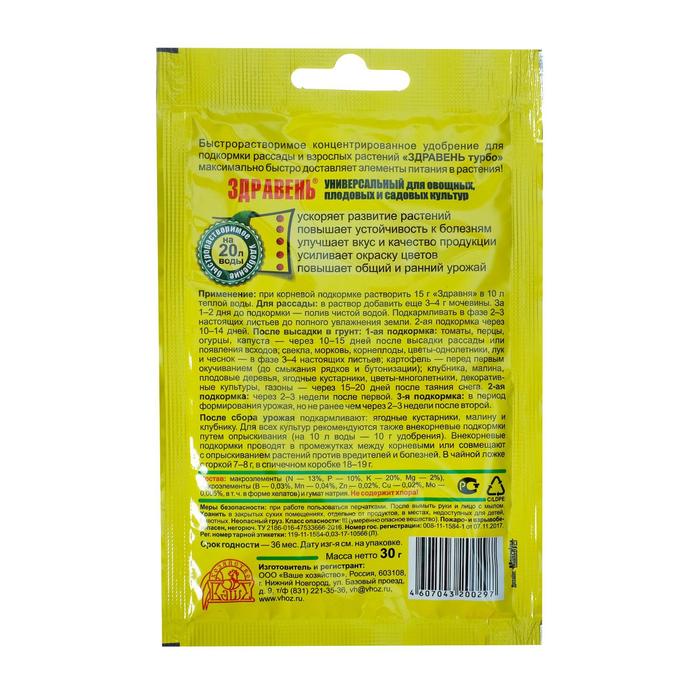 Иногда садоводам и огородникам в условиях дефицита времени необходимо произвести подкормку различных растений, а специализированных видов удобрения «ЗДРАВЕНЬ » под рукой нет. В этом случае Вам на выручку придет «ЗДРАВЕНЬ турбо универсальный», который также содержит все необходимые вещества. Конечно, эффект от такой подкормки будет несколько меньше, но все же он будет весьма высоким. Ведь известно, что хорошее решение в нужное время всегда лучше, чем прекрасные решения не вовремя.