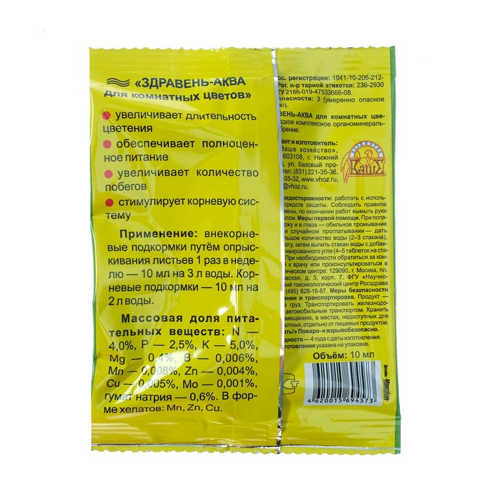Удобрение «Здравень-аква», для комнатных цветов, 10 мл
