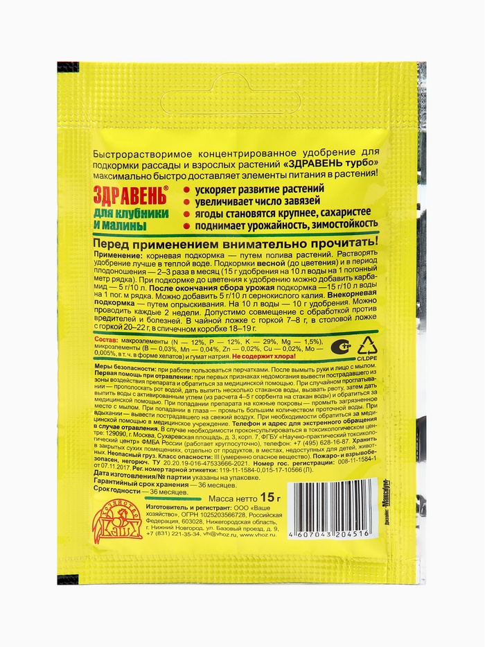 Удобрение "Здравень турбо" для клубники и малины, 15 г