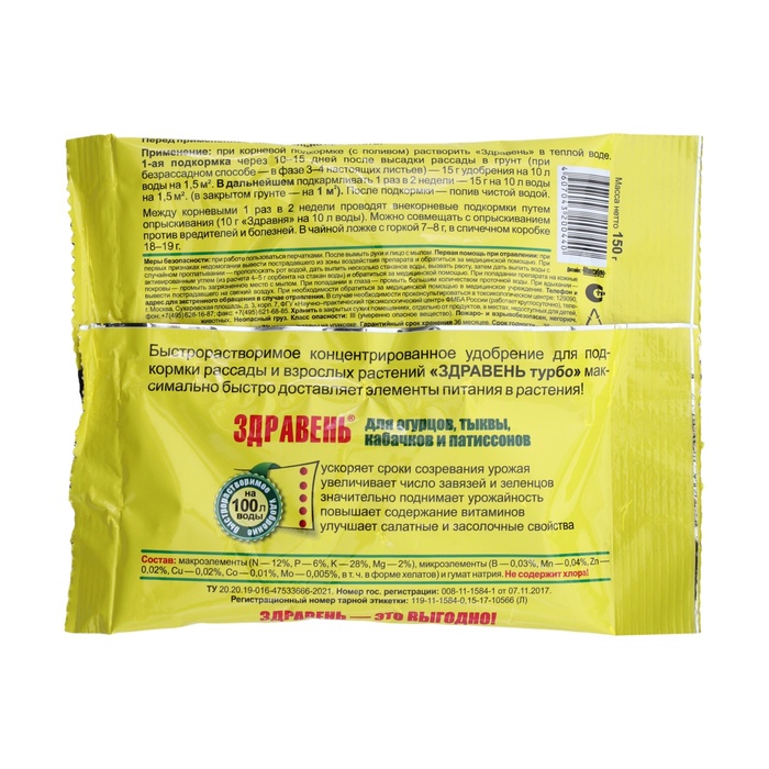 Удобрение Здравень турбо для огурцов, тыквы, кабачков и патиссонов, 150 г