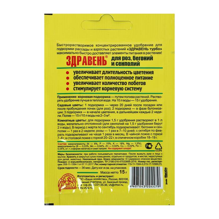 Удобрение "Здравень турбо" для роз, бегоний и сенполий, 15 г
