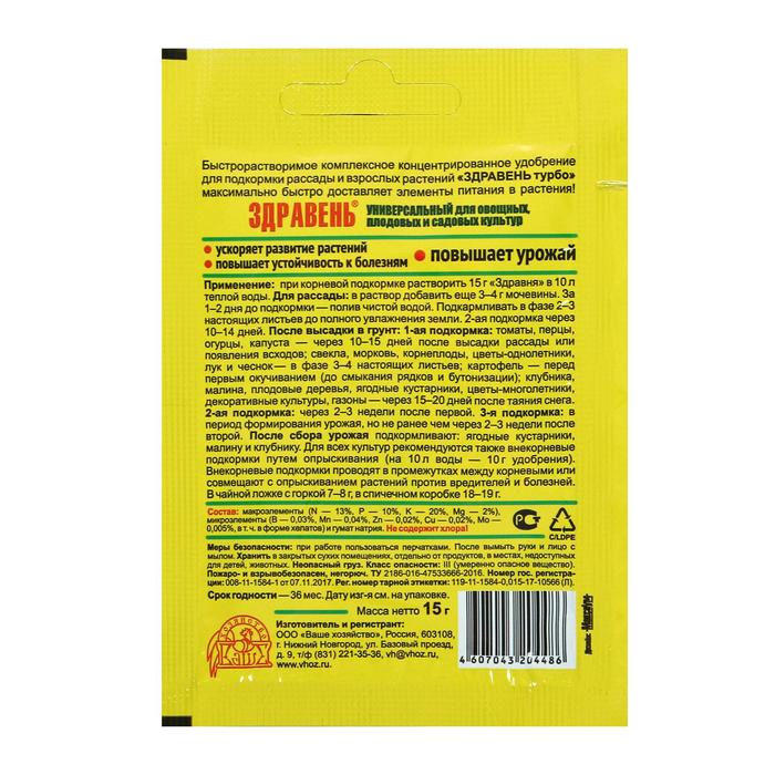 Удобрение "Здравень турбо" Универсальный для овощных, плодовых и садовых культур, 15 г