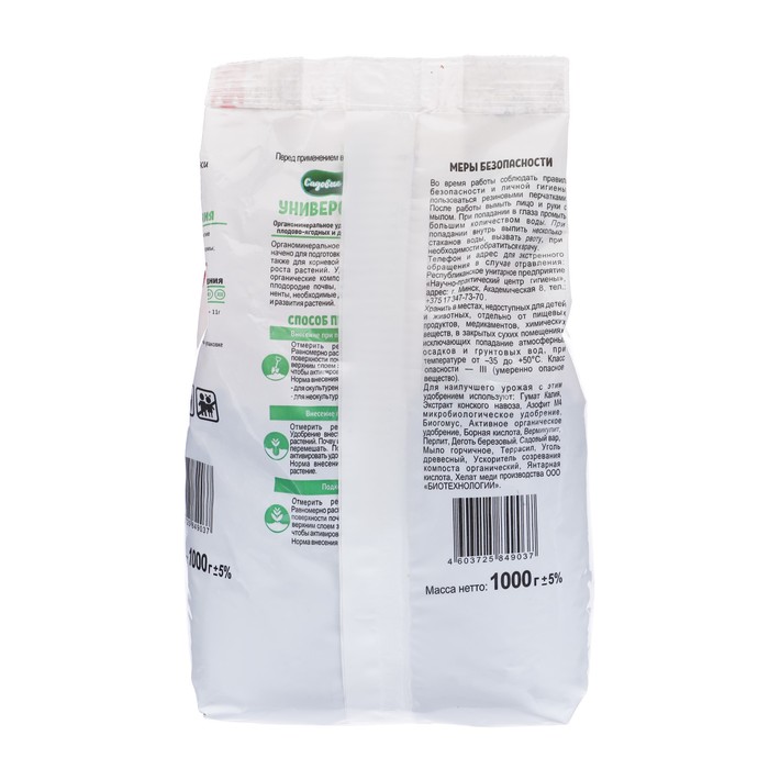 ОМУ «Универсал» содержит в своем составе 40% органического вещества, азот, фосфор, калий, магний и микроэлементы, гуминовые соединения. Для обеспечения увеличения продуктивности культуры и восстановления плодородия почвы, органоминеральное удобрение ОМУ «Универсал» модифицировано микробиологическим препаратом на основе ризосферных бактерий.