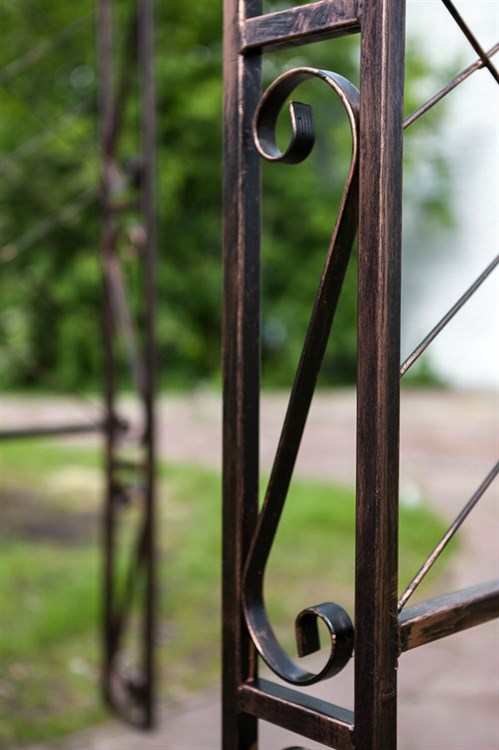 Кованая садовая арка с красивым сводом, даже без растений покрывающих ее выглядит замечательно! Ажурный узор, напоминающий завитки, призван визуально выделить крону вьющихся растений для поддержки которых арка и задумывалась. По ней можно пустить:
