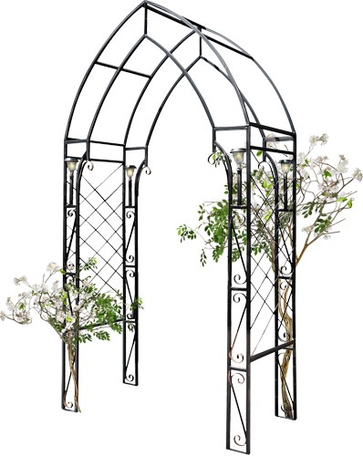Четыре светодиодных фонаря на солнечных батареях подсветят сказочным ореолом чудесную конструкцию из цветов и металла вечером и ночью. Садовая арка устойчиво стоит на четырех опорах, которые, при желании, можно забетонировать или прикрутить к твердой поверхности.