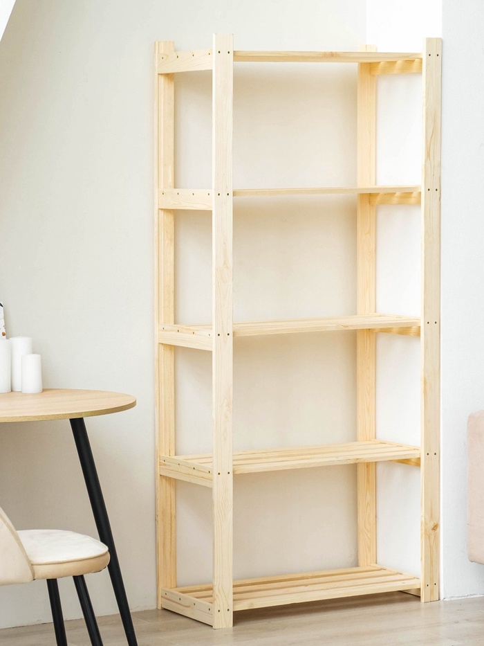 * Пять вместительных полок: деревянные стеллажи предлагают достаточно места для хранения книг, документов или декоративных элементов. Ваша коллекция книг или фотографии смогут найти здесь своё место.