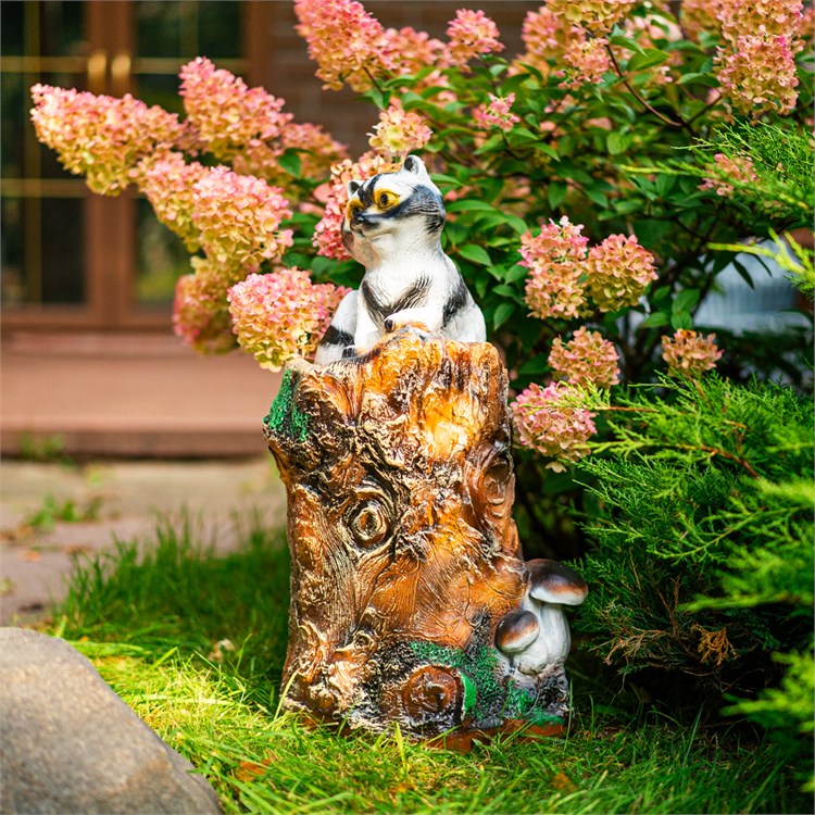Эта милая декоративная скульптура в виде маленького енота, уютно расположившегося на пне, станет прекрасным украшением вашего сада, дачи или террасы. Высота 60 см делает фигуру заметной, но при этом гармонично вписывающейся в природный ландшафт.