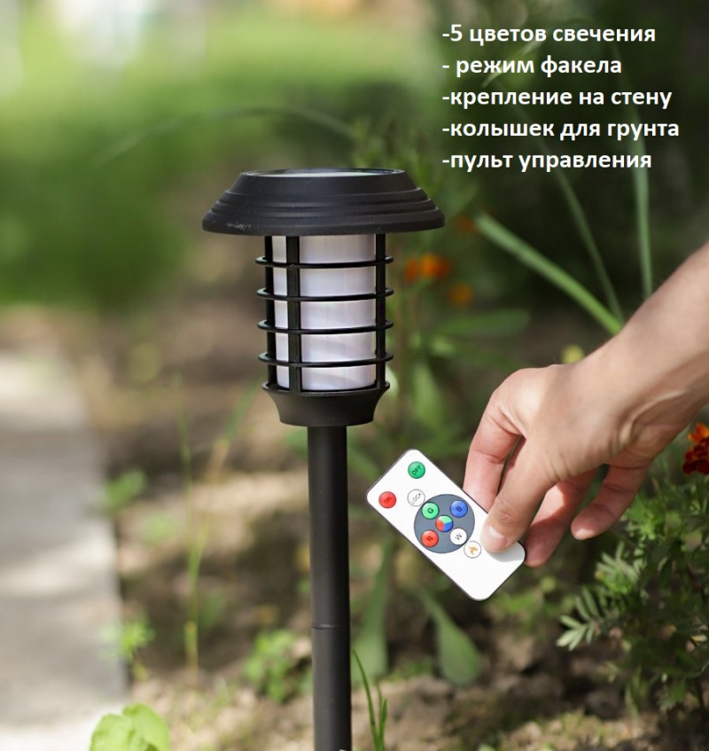 Уличный фонарь факел с пультом управления можно закрепить на стену или воткнуть в грунт. Встроенная солнечная панель с аккумулятором позволит использовать фонарь факел в любом месте садового участка. 5 цветов, свечения на любое настроение и ландшафт. 4 цвета + эффект живого пламени. Датчик света, включает фонарь в темное время суток, с одного пульта можно управлять несколькими фонариками, не боятся влаги. Не рекомендуем использовать при низких отрицательных температурах воздуха.