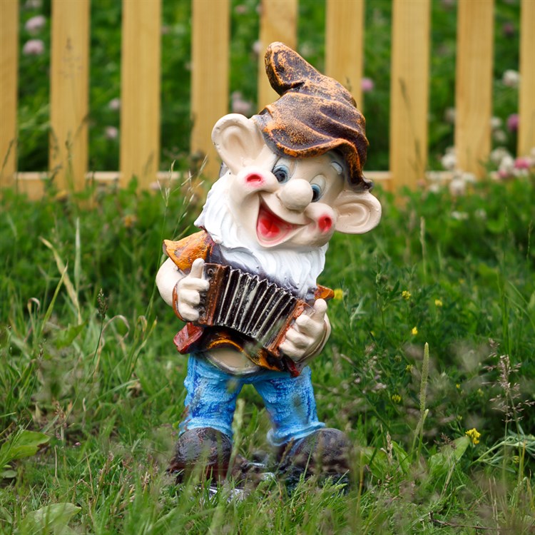 Садовая фигура гном с гармонью. Милая сказочная фигурка украсит любое пространство. Веселый гном поднимет настроение любому гостю садового участка.