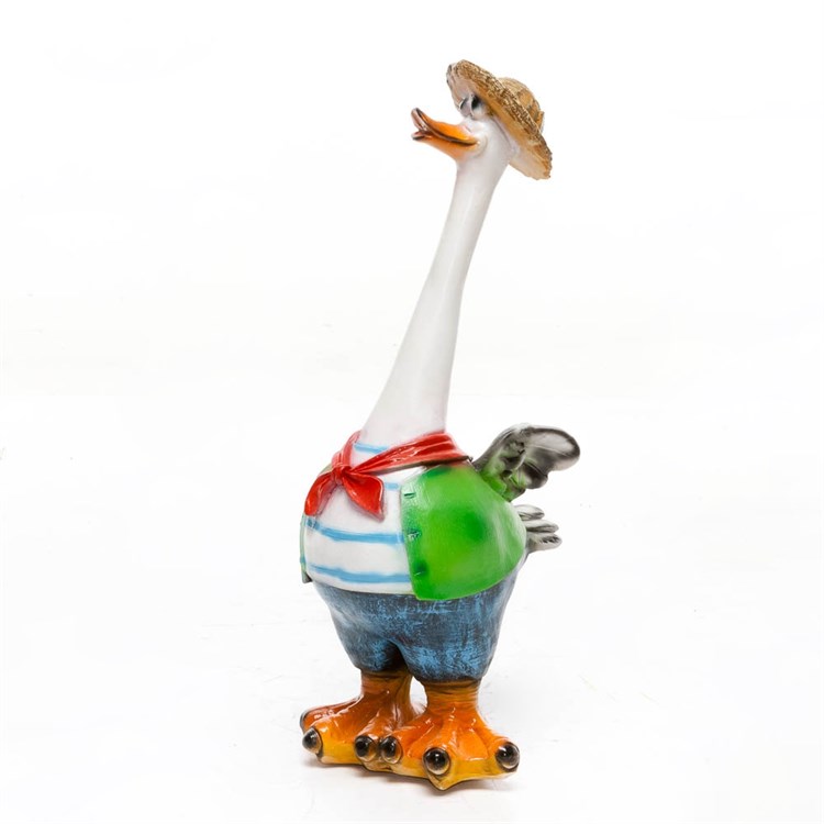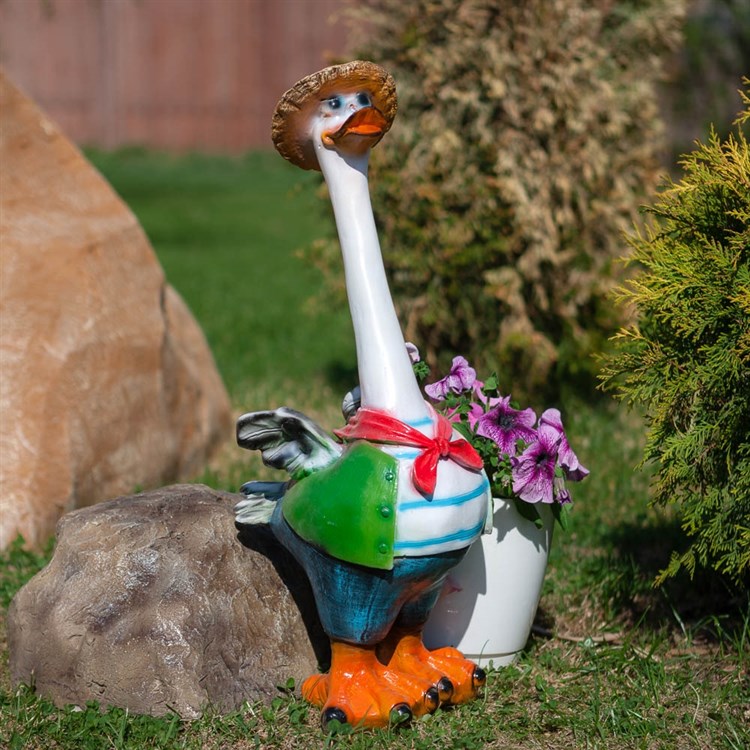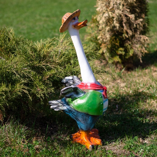 Декоративная яркая фигурка Гусь. Мультяшная фигура не оставит равнодушным ни одного ребенка. Поэтому может использоваться для украшения не только дачных участков, но и детских садов и парков.
