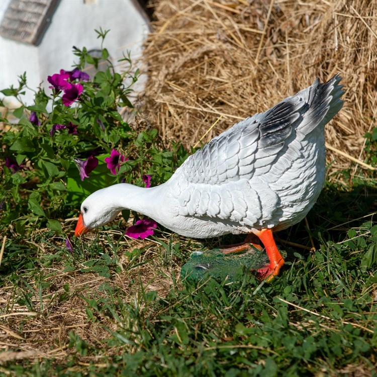 Садовая фигура гусыня выглядит очень естественно. Четко оформленные перья птицы создают ощущение натуралистичности.