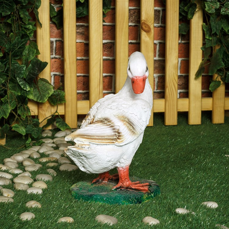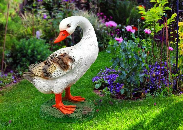 Садовая фигура гусыня выглядит очень естественно. Четко оформленные перья птицы создают ощущение натуралистичности. Такую фигурку можно купить в комплекте с другими декоративными птицами, которые вы можете выбрать в категории "Птицы - садовые фигуры".