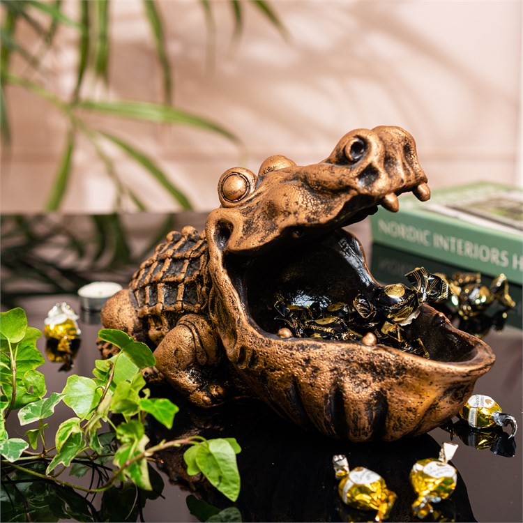 Эта оригинальная конфетница оформлена в виде крокодила, который привнесёт юмор и экзотику в вашу кухню или гостиную. Изготовленная из прочного полистоуна, она устойчива к влаге и механическим воздействиям, обеспечивая долговечность и лёгкий уход. Идеально подходит для хранения конфет, печенья или фруктов, превращая обыденное в весёлое.