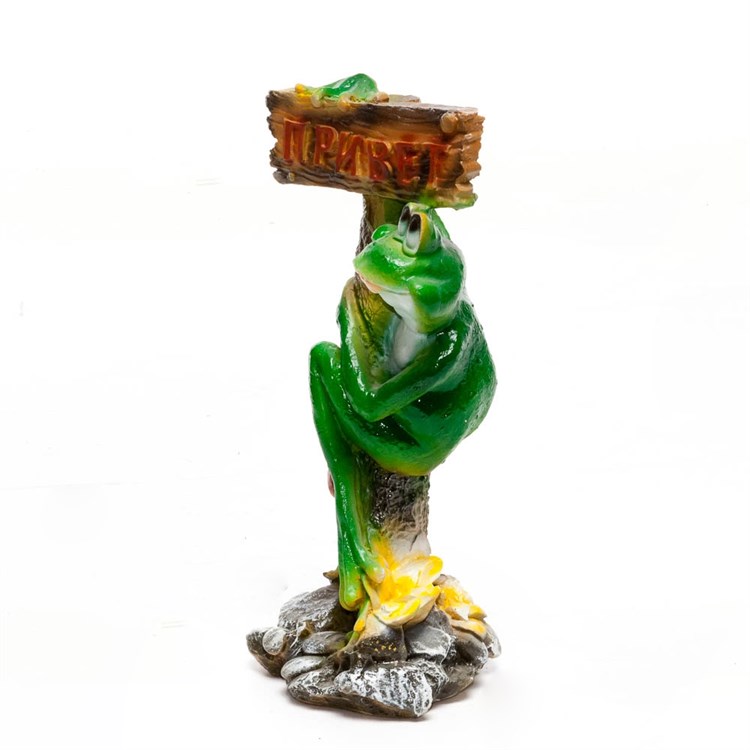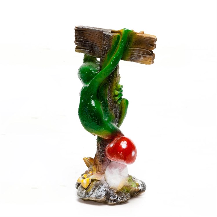 Садовая фигурка Лягушка с табличкой. Материал изготовления: полистоун (влагостойкий). Фигура подходит для декора садовых участков, оформления зоны рядом с водоемом или прудом на даче.