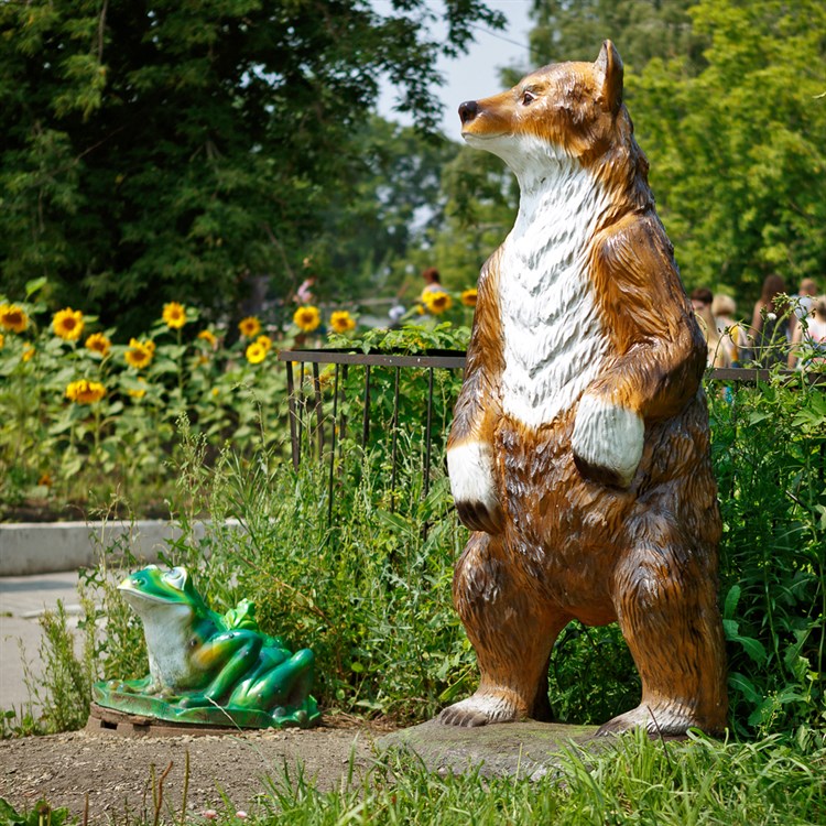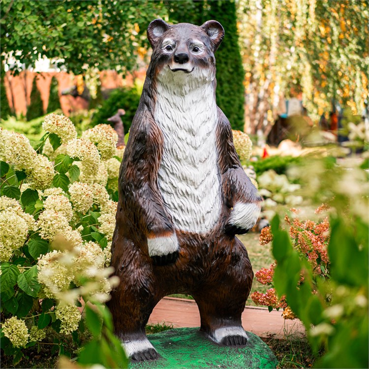 Садовая фигура медведь большой. Выполнен из композитного материала. Имеет натуральный рост. На дачном участке создает ощущение присутствия настоящего лесного зверя. На зиму фигуру можно не убирать. Выдерживает перепады температуры, осадки.